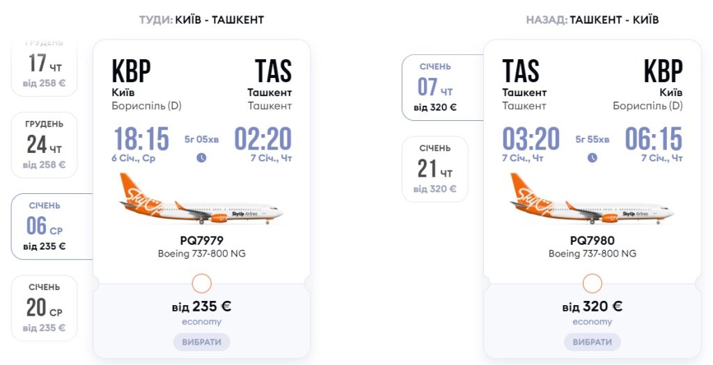 Київ – Ташкент – Київ (06.01.2021 – 07.01.2021) – €555