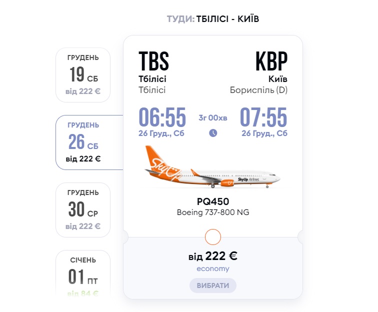 Тбілісі — Київ: 19.12.2020, 26.12.2020, 30.12.2020. Ціни на квитки стартують від €222.