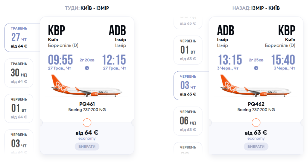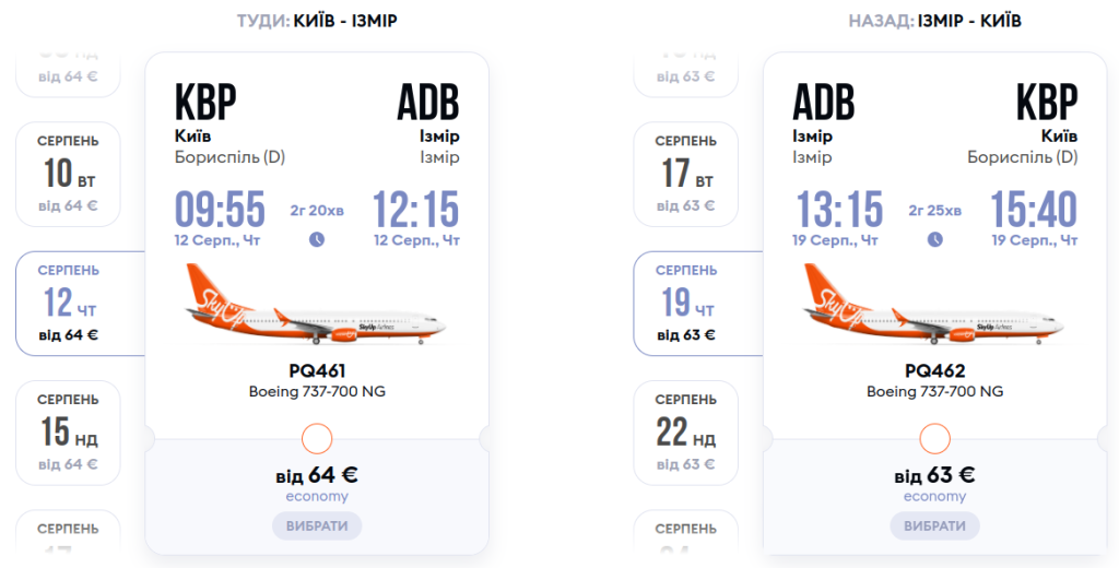 SkyUp пропонує рейси Київ – Ізмір – від €64 в один бік або €127 туди-назад. Рейси виконуватимуть щовівторка, щочетверга та щонеділі.