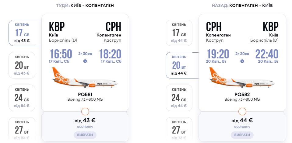 Пряме сполучення між Києвом та Копенгагеном SkyUp має намір відкрити з 17 квітня 2021-го. Частото польотів – два рейси на тиждень, по суботах та вівторках. Вартість квитків – від €43 в один бік або €87 туди-назад.