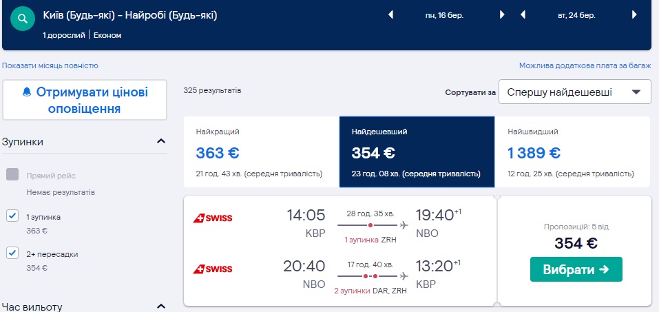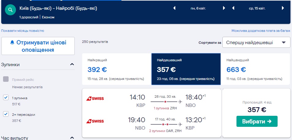 Вартість квитків до Кенії – від €354 в обидві сторони. Авіарейси здійснюються з пересадками у Швейцарії і Танзанії. В ціну включено зареєстрований багаж до 23, ручну поклажу та харчування під час перельотів.