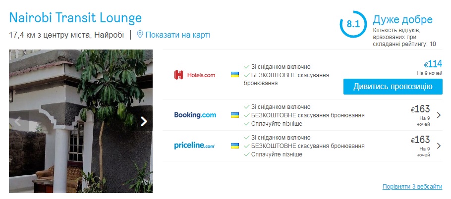 Для бюджетного проживання – Nairobi Transit Lounge – від €114 за місце у хостелі.