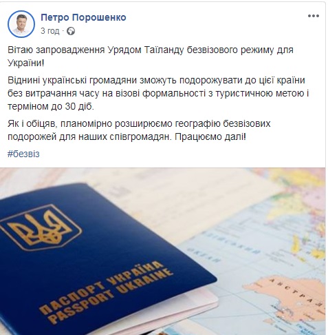 Про це повідомив Президент України Петро Порошенко у себе на сторінці Facebook: