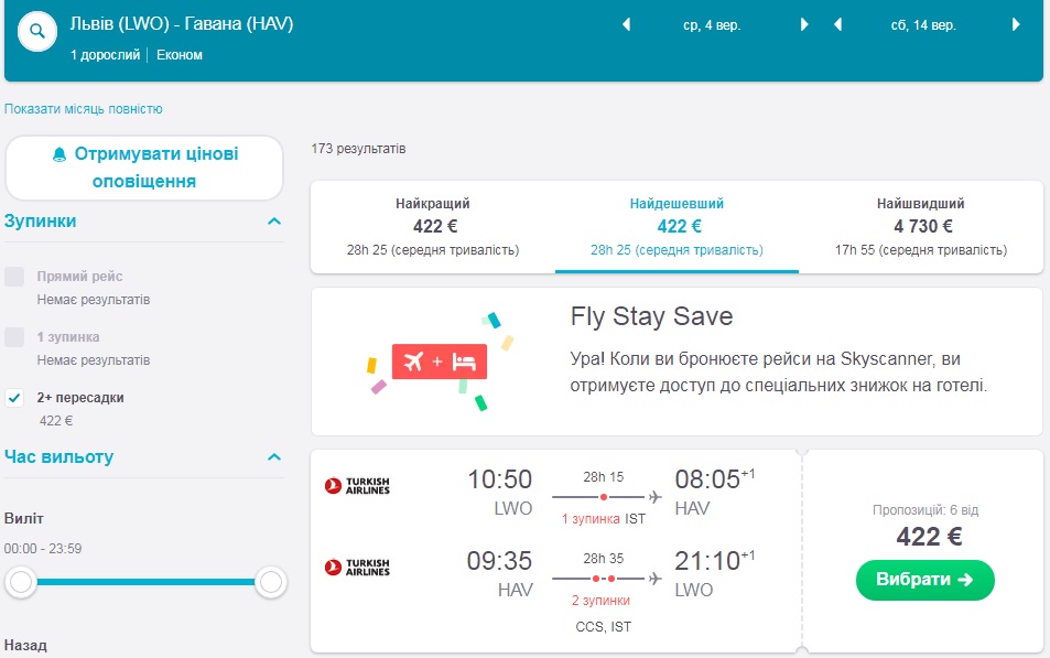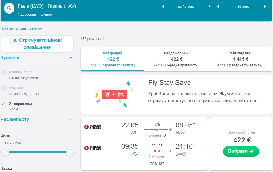 Авіакомпанія Turkish Airlines пропонує хорошу ціну на переліт зі Львова на о. Куба. Вартість квитків Львів-Гавана – від €422 в обидві сторони.