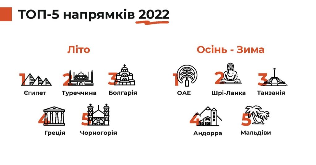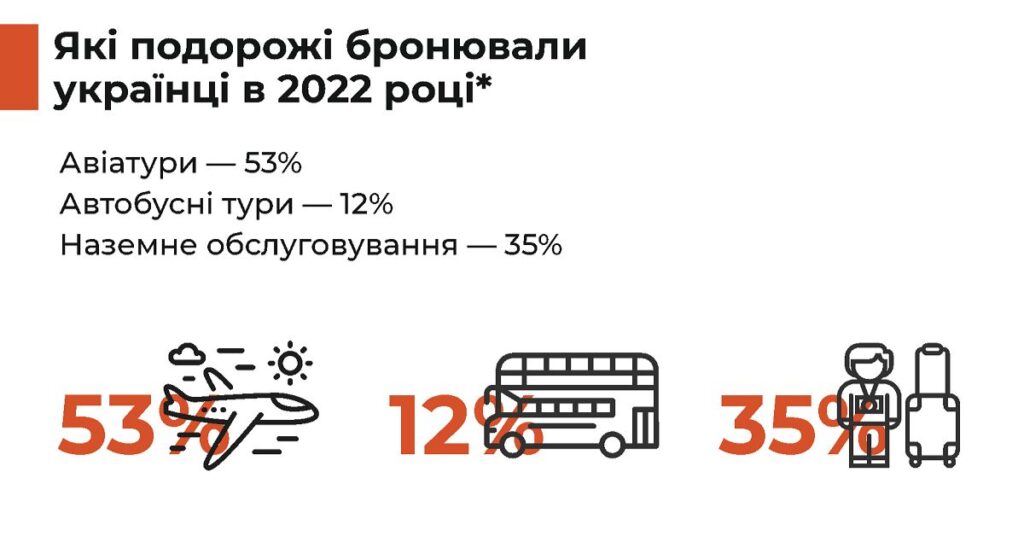 Також минулого року стрімко зріс попит на подорожі Україною. У жовтні туристи забронювали вдвічі більше турів країною ніж у 2021 році. Передумовами такого росту є обмеження виїзду для чоловіків за кордон, а також зростання запиту на дослідження історії та культури України.