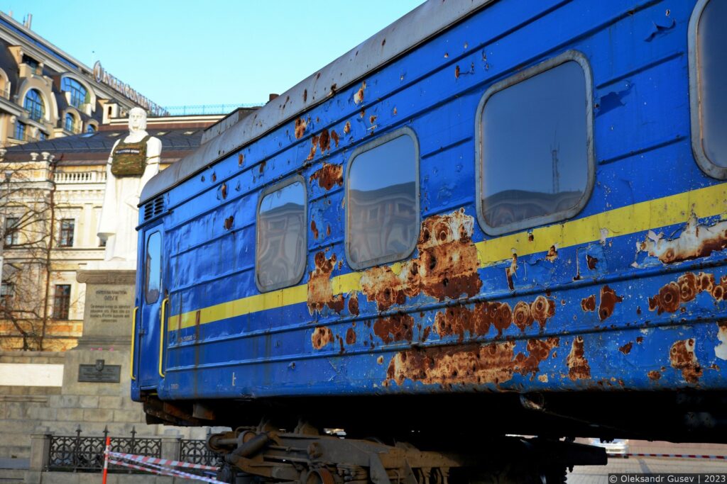 На Михайлівській площі встановили обстріляний росіянами вагон Укрзалізниці. За допомогою крана вагон поставили на колію, де він стоятиме близько місяця, пише Вечірній Київ.