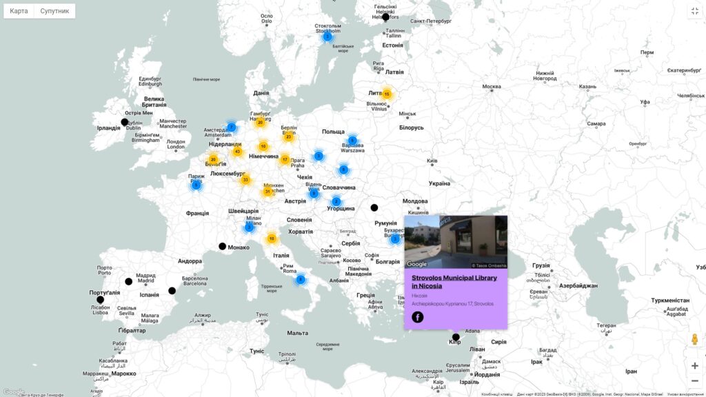 Проєкт спрямований на висвітлення ініціатив, які працюють над поширенням української книги для українських біженців за кордоном. На інтерактивній мапі можна знайти місця, де зберігаються українські книжки.