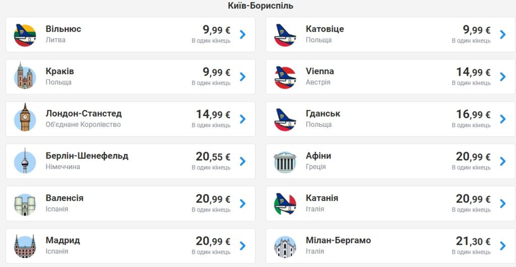 Летіти можна з Києва, Львова, Одеси та Харкова на різні європейські напрямки – від €10 в одну сторону.