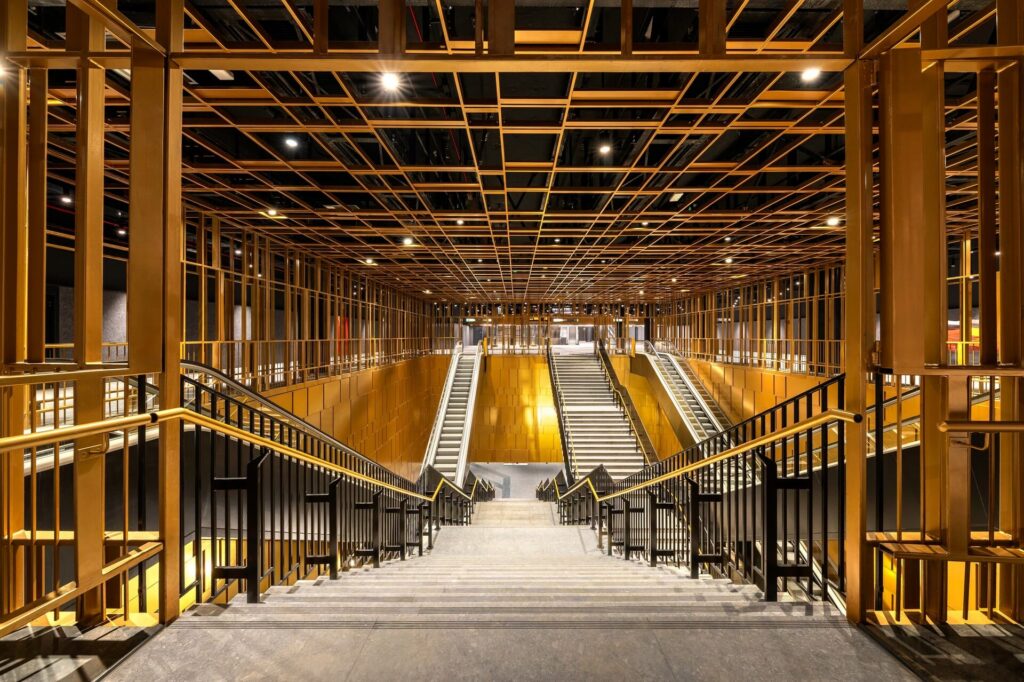 - Інтер’єр: підлога з темного каменю, бронзові вставки та м’яке світло створюють атмосферу «живої історії».
