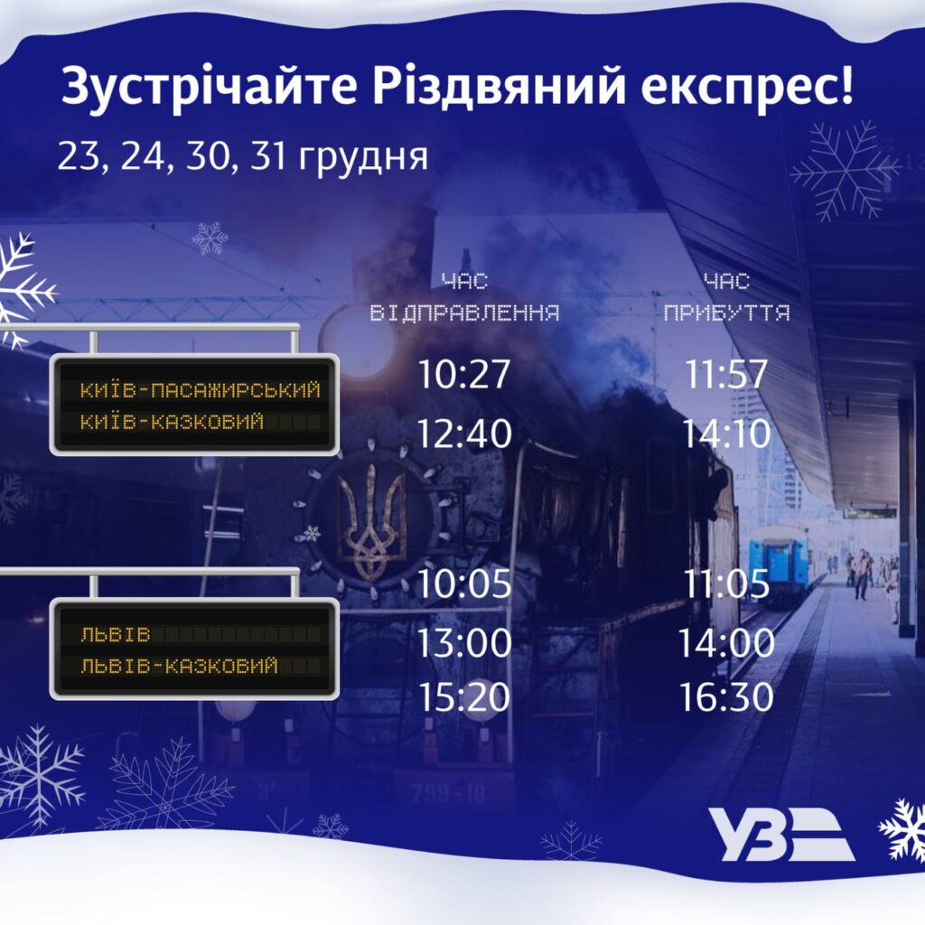 Як повідомила пресслужба “УЗ”, різдвяні експреси у Києві відправлятимуться двічі на день: о 10:27 та о 12:40. У Львові поїзди відправлятимуться тричі на день: о 10:05, о 13:00 та о 15:20.