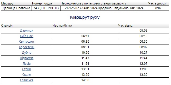 “Лижний експрес” курсуватиме з Києва, починаючи з 21 грудня, о 6:11, і прибуватиме до станції Славсько о 14:00. У зворотному напрямку, зі станції Славсько, поїзд відправлятиметься о 14:30 і прибуватиме до Києва о 22:26.