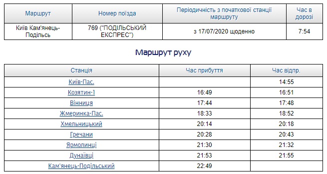 З 17 липня Укрзалізниця відновить курсування поїзду №769/757-770/758 Київ – Кам’янець-Подільський – Могилів-Подільський. Поїзд робитиме зупинки у Вінниці, Жмеринці, Хмельницькому та інших містах.