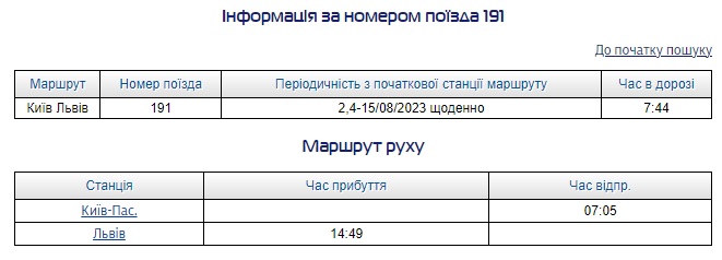 Поїзд №191/192 Київ — Львів: відправлятиметься з Києва 4, 5, 6, 11, 12 та 13 серпня о 7:05 і прибуватиме до Львова о 14:49. У зворотному напрямку, зі Львова, поїзд відправлятиметься в ті ж дати о 14:37 і прибуватиме до Києва о 22:05.