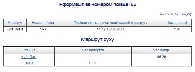 Поїзд №163/164 Київ — Львів: відправлятиметься з Києва 11, 12 та 13 серпня о 6:28 і прибуватиме до Львова о 13:58. Зворотно, зі Львова, поїзд відправлятиметься в ті ж дати о 14:50 і прибуватиме до Києва о 22:27.