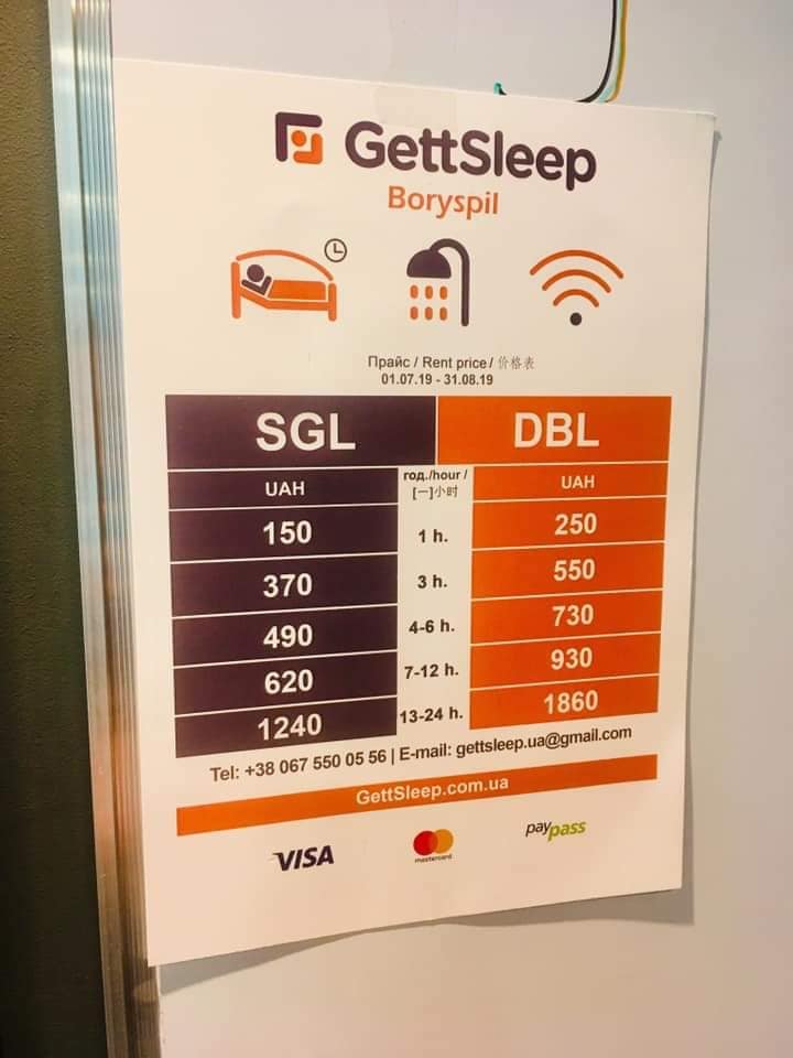 В терміналі D аеропорту “Бориспіль” можна переночувати в капсульному хостелі “GettSleep Boryspil”, що пропонує погодинну оплату за перебування.