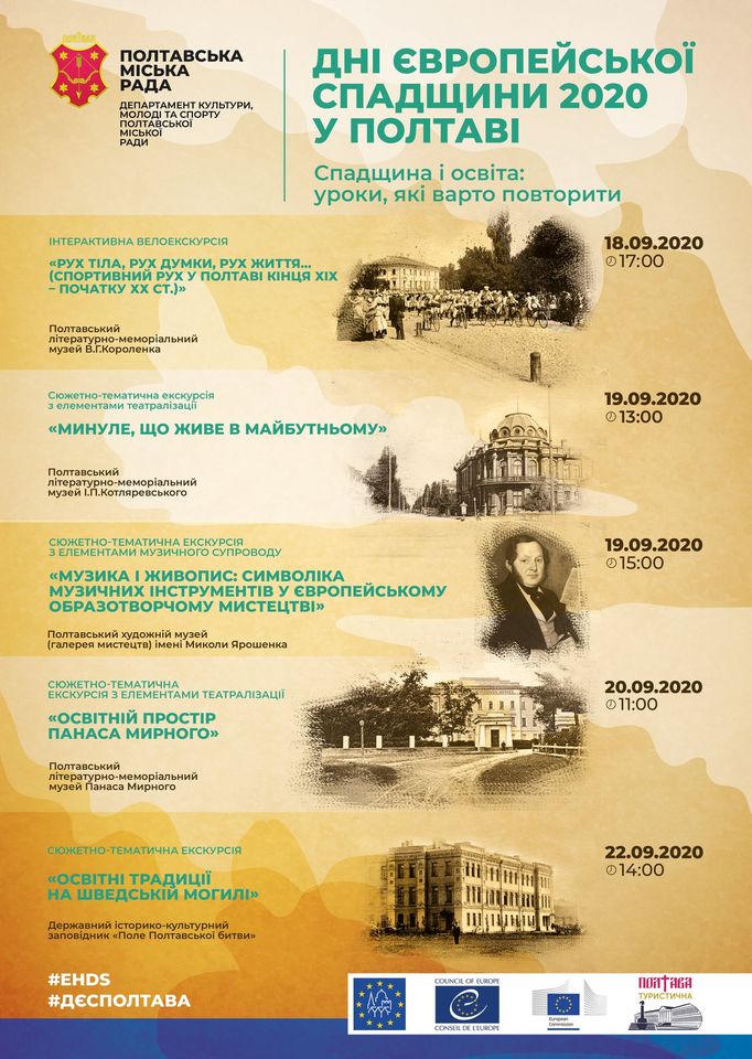 В рамках Днів європейської спадщини в Полтаві, у період з 18 по 22 вересня, проведуть п’ять безкоштовних тематичних екскурсій.