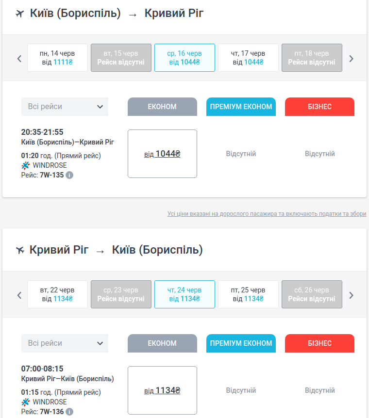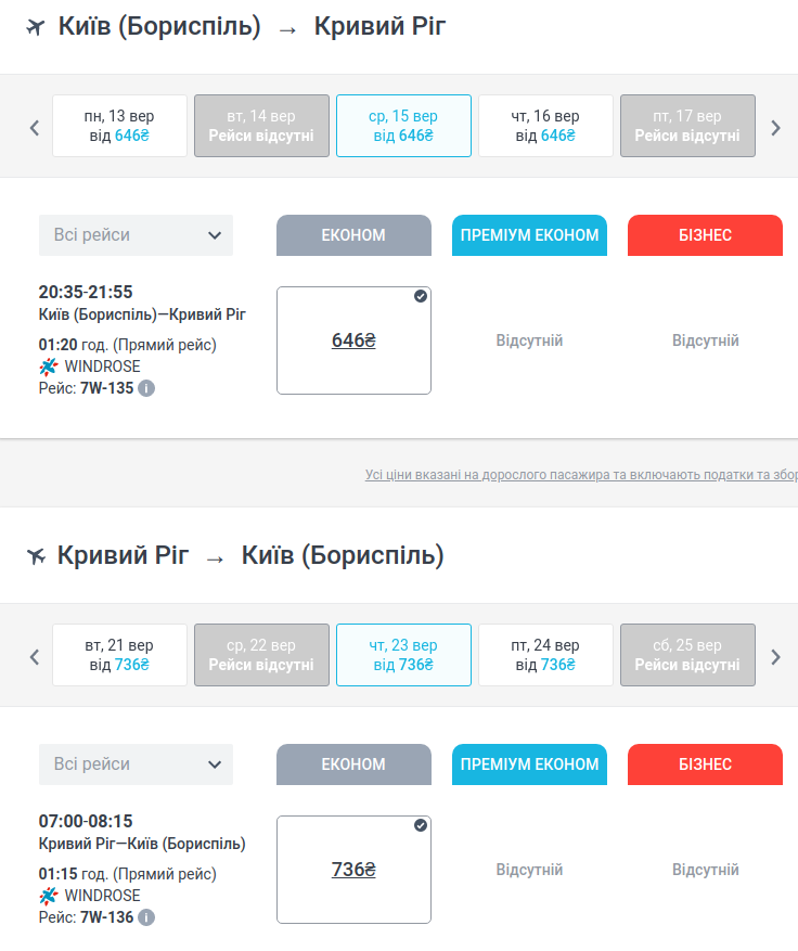 Вартість квитків, якщо замовляти за три місяці – ₴646 в один бік або ₴1382 туди-назад. Квитки на ближчі дати – від ₴1050 в одну сторону. Всі тарифи Windrose включають ручну поклажу до 7 кг та зареєстрований багаж до 23 кг.