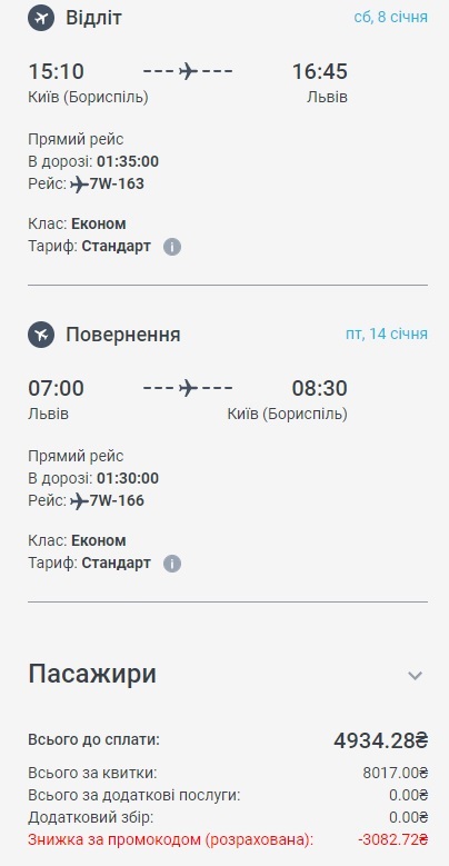 Знижка застосовується до тарифу “Стандарт”. Аеропортові збори пасажир сплачує самостійно. Квитки придбані за промокодом обмінну не підлягають. Заборонено вносити зміни у квитках, придбаних за акційними промокодами.