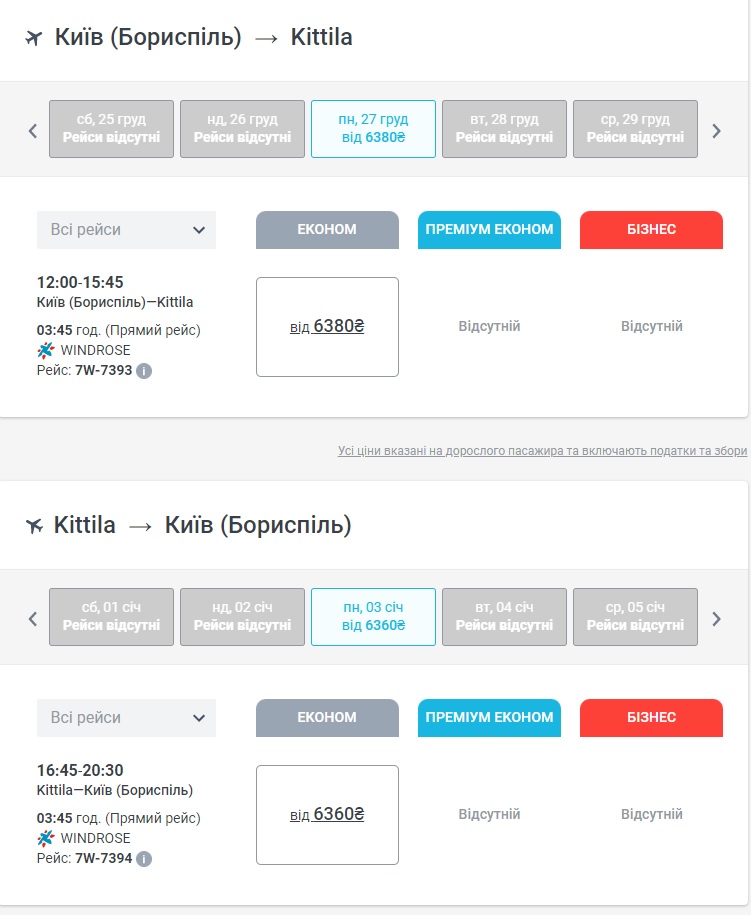 В системі бронювання Windrose з’явились квитки на прямі рейси до Лапландії. Заплановані перельоти на 27 грудня, 3 та 10 січня. Час в дорозі 3 год 45 хв.