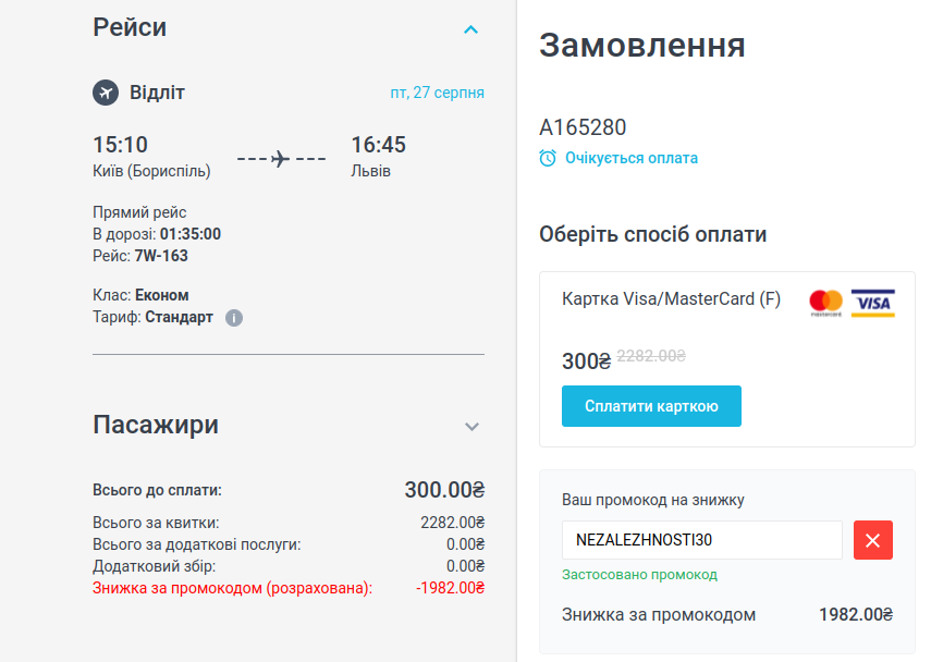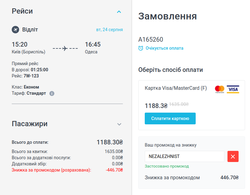 Знижка 30% дійсна лише один день – 24 серпня, на всі внутрішні рейси, що виконуються у цю дату. Під час бронювання квитки потрібно ввести промокод: NEZALEZHNIST.