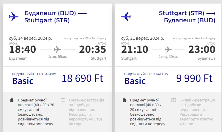 В ціні за даними тарифами — лише ручна поклажа (40 x 30 x 20 см), яка розміщується під сидінням попереду.
