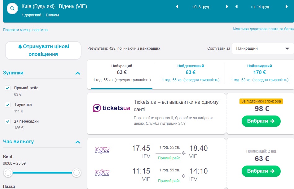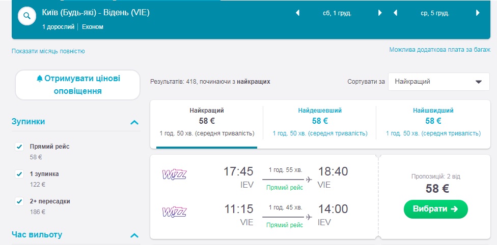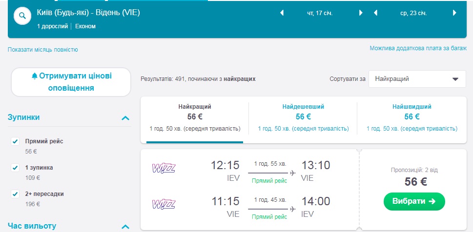 Лоукост Wizz Air пропонує дешеві авіаквитки на рейси з Києва до Відня. Ціна за переліт в обидві сторони до австрійської столиці – від €56, для учасників клубу – від €41. Варіанти для подорожей потрібно підбирати на грудень-лютий.