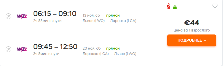 Вартість прямих рейсів Wizz Air Львів – Ларнака – від €15 в один бік або €37 туди-назад. В найдешевших тарифах – тільки ручна поклажа (40х30х20 см), яка розміщується під сидінням попереду.