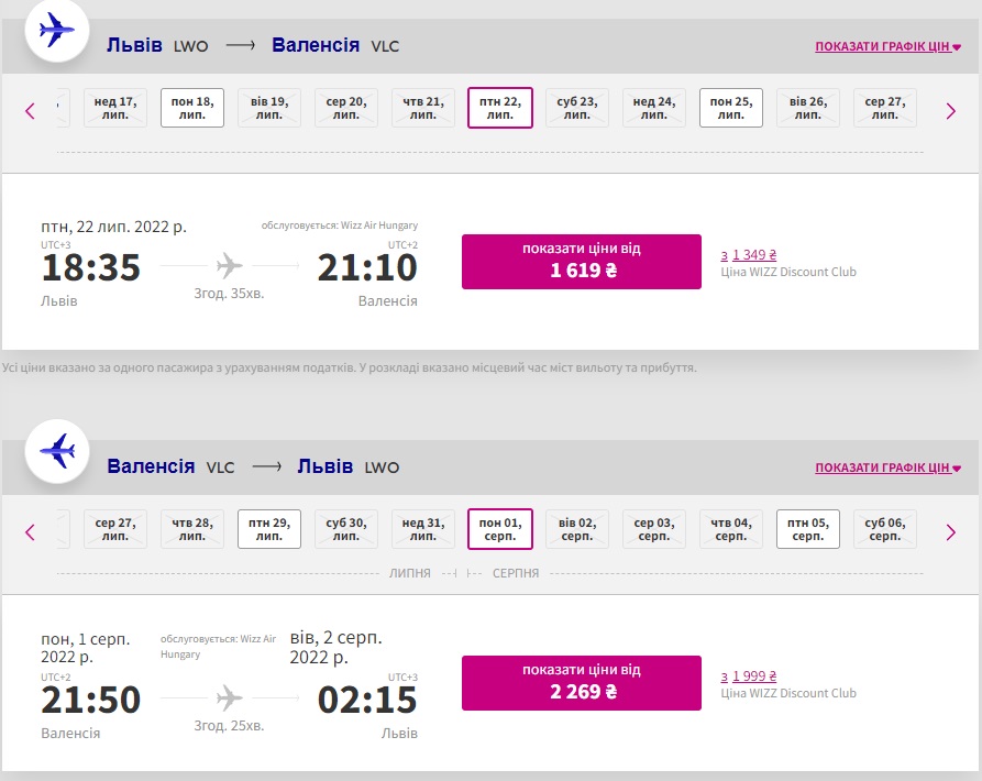 Вартість квитків Львів – Валенсія – від €54 в одну сторону або €130 в обидва боки.