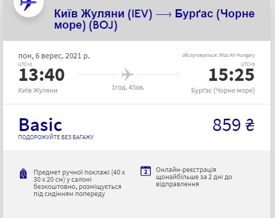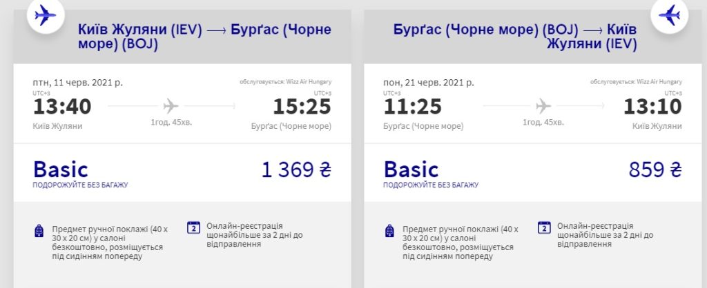 В ціні за даними тарифами – ручна поклажа (40х30х20). Замовляти квитки потрібно на сайті Wizz Air.