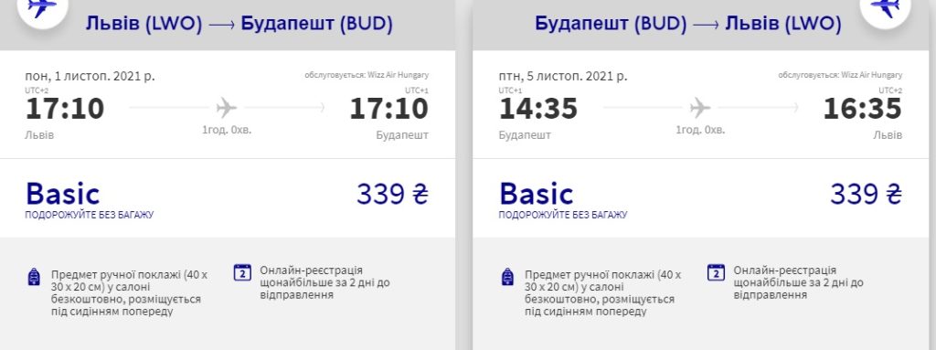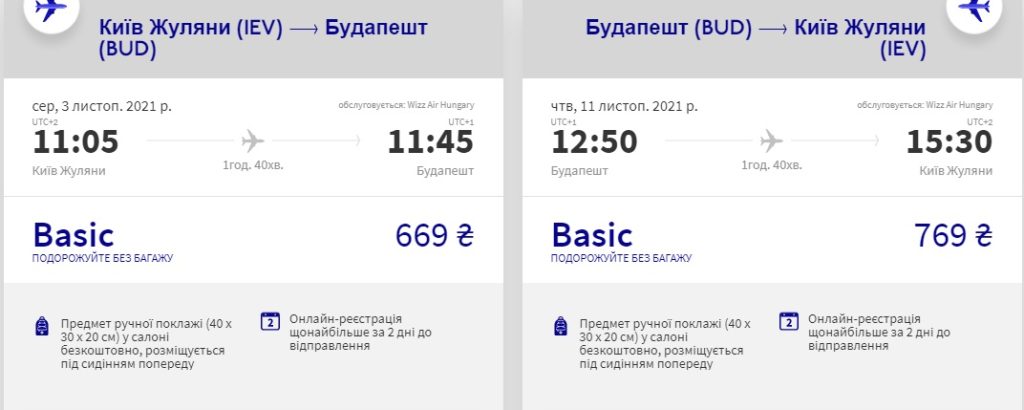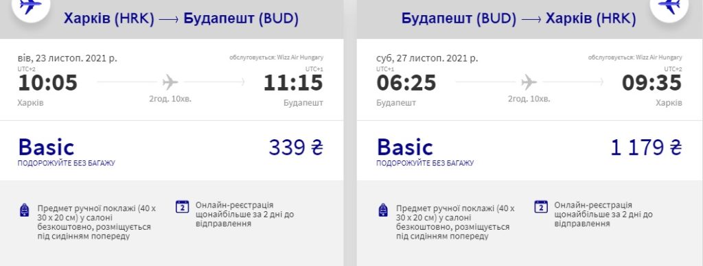 Вартість квитків на прямі рейси Wizz Air Київ – Будапешт – від €21 в один бік або €45 туди-назад. В найдешевших тарифах – тільки ручна поклажа.