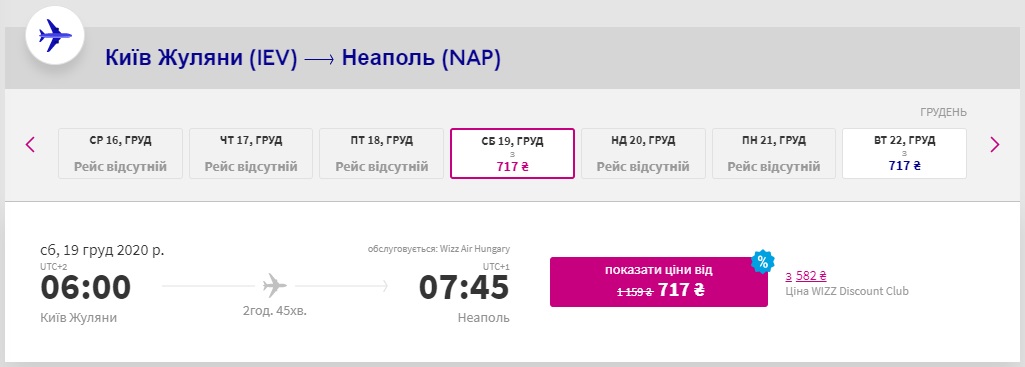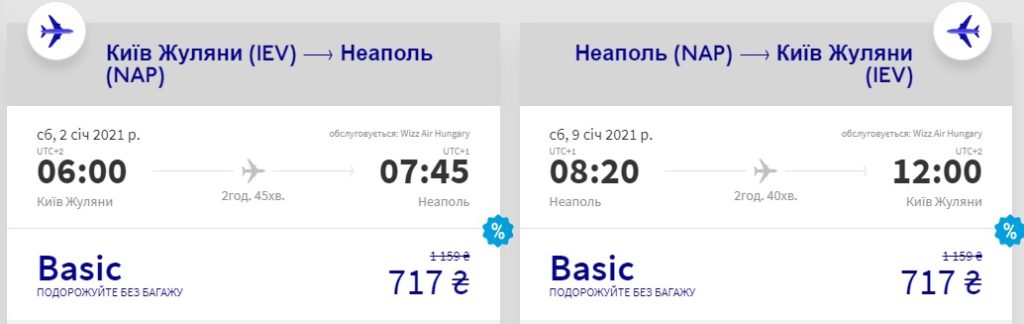 Нові рейси з Києва у Неаполь виконуватимуться двічі на тиждень – щовівторка та щосуботи. Польоти заплановані до 16 січня 2021.