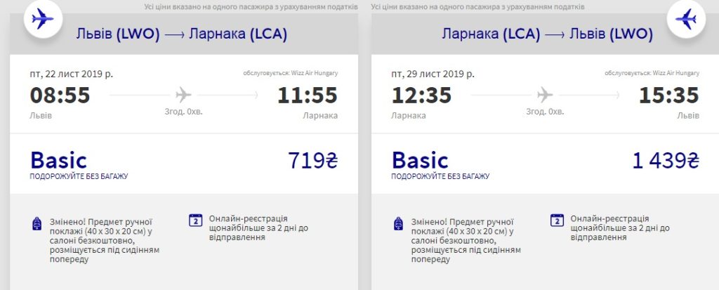Квитки вже доступні для бронювання на сайті авіакомпанії за ціною від €15 (€10 для Wizz Discount Club) за переліт з Одеси та від €25 (€15 для WDC) за переліт зі Львова в Ларнаку!