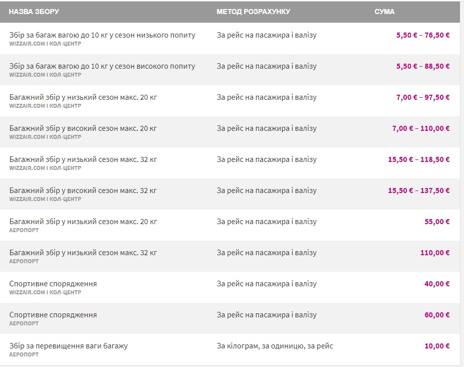 Як свідчить інформація з сайту компанії, якщо вартість перевезення багажу до 10 кг раніше коливалась від €9 до €57 то тепер – від €5.5 до €88.5. Багаж до 20 кг тепер коштуватиме – від €7 до €110, до 32 кг – від €15.5 – €137.5.