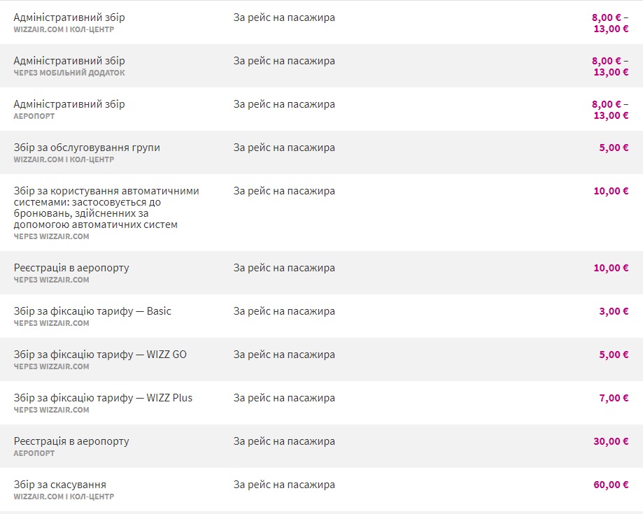 Крім того, Wizz Air підвищила максимальний адміністративний збір – від €8 до €13. Зміни також торкнулись й інших зборів, до прикладу максимальна вартість Wizz Priority тепер становить €39.2.