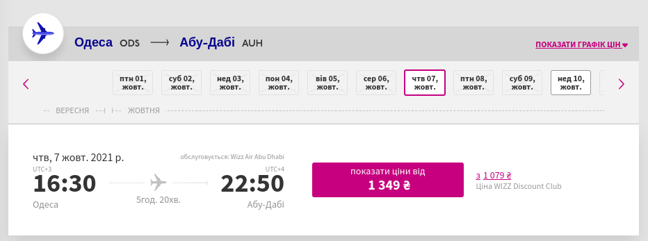 З 1 липня 2021 Wizz Air виконує рейси з Києва (Бориспіль) до Абу-Дабі. Прямі рейси Київ – Абу-Дабі виконуватимуть з аеропорту “Бориспіль”. Частота польотів – три рейси на тиждень (вівторок, четвер, неділя). Вартість квитків — від €47 туди-назад.
