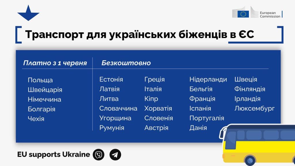 Як повідомляє офіційний телеграм-канал Європейського Союзу про підтримку України, з червня деякі країни частково скасують безкоштовний проїзд для українців. Серед них – Польща, Німеччина, Болгарія, Швейцарія та Чехія.