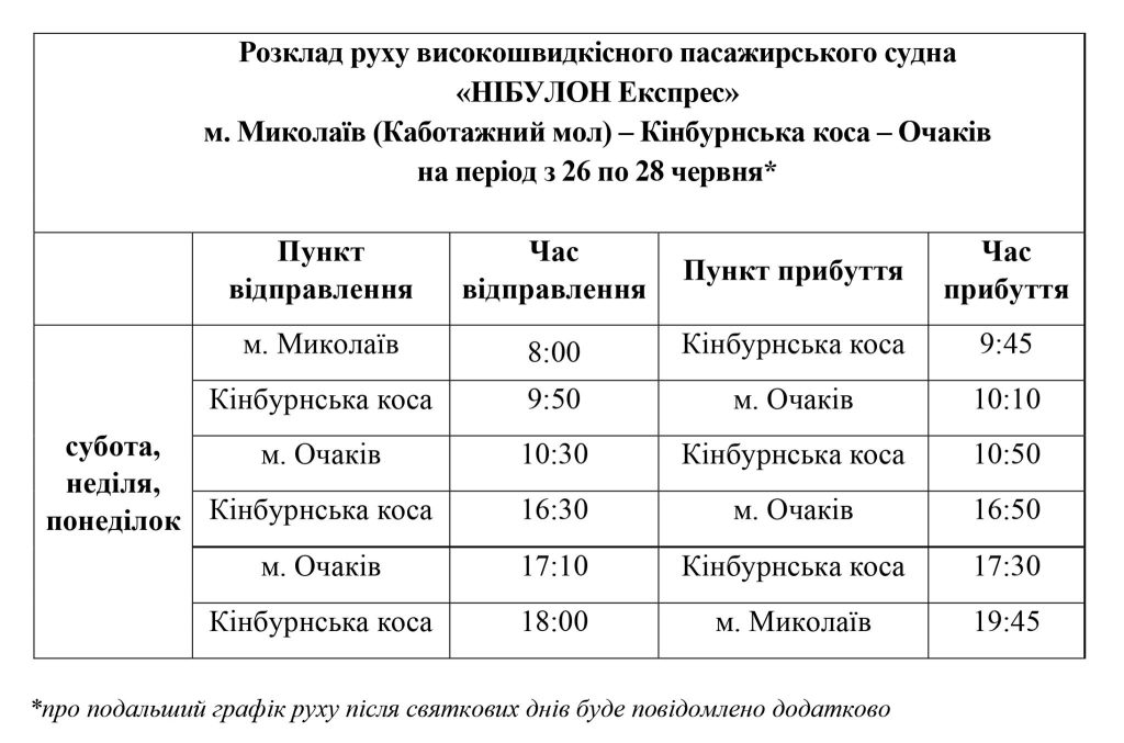 Перевезення здійснюватимуть з 26 червня 2021. На святкові дні до 28 червня діє спеціальний графік руху. Про подальший розклад буде повідомлено згодом.