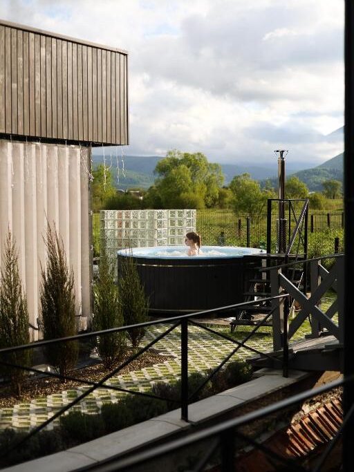 На свіжому повітрі можна готувати на дровах, вони тут безплатні. І, звичайно, тебе розслабить купання в чані. Він довго тримає температуру, може використовуватись ввечері й зранку, а звідтам можна помилуватись неймовірною красою Карпат.