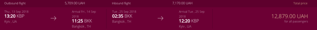 Акційні квитки є на літо, осінь, щось можна вихопити і зимою. Ось приклад що нам вдалося знайти на вересень до Бангкоку з Києва туди-назад: